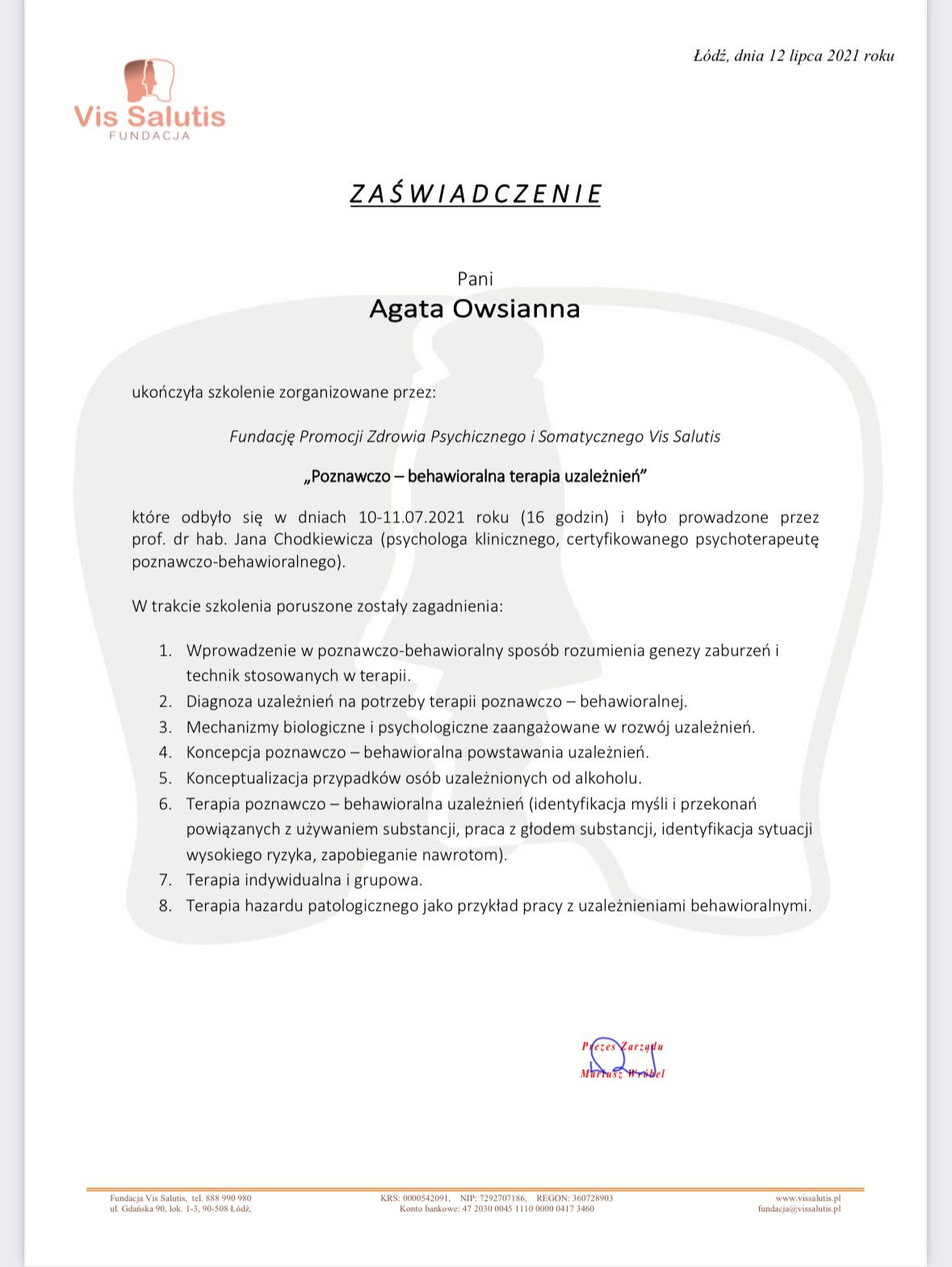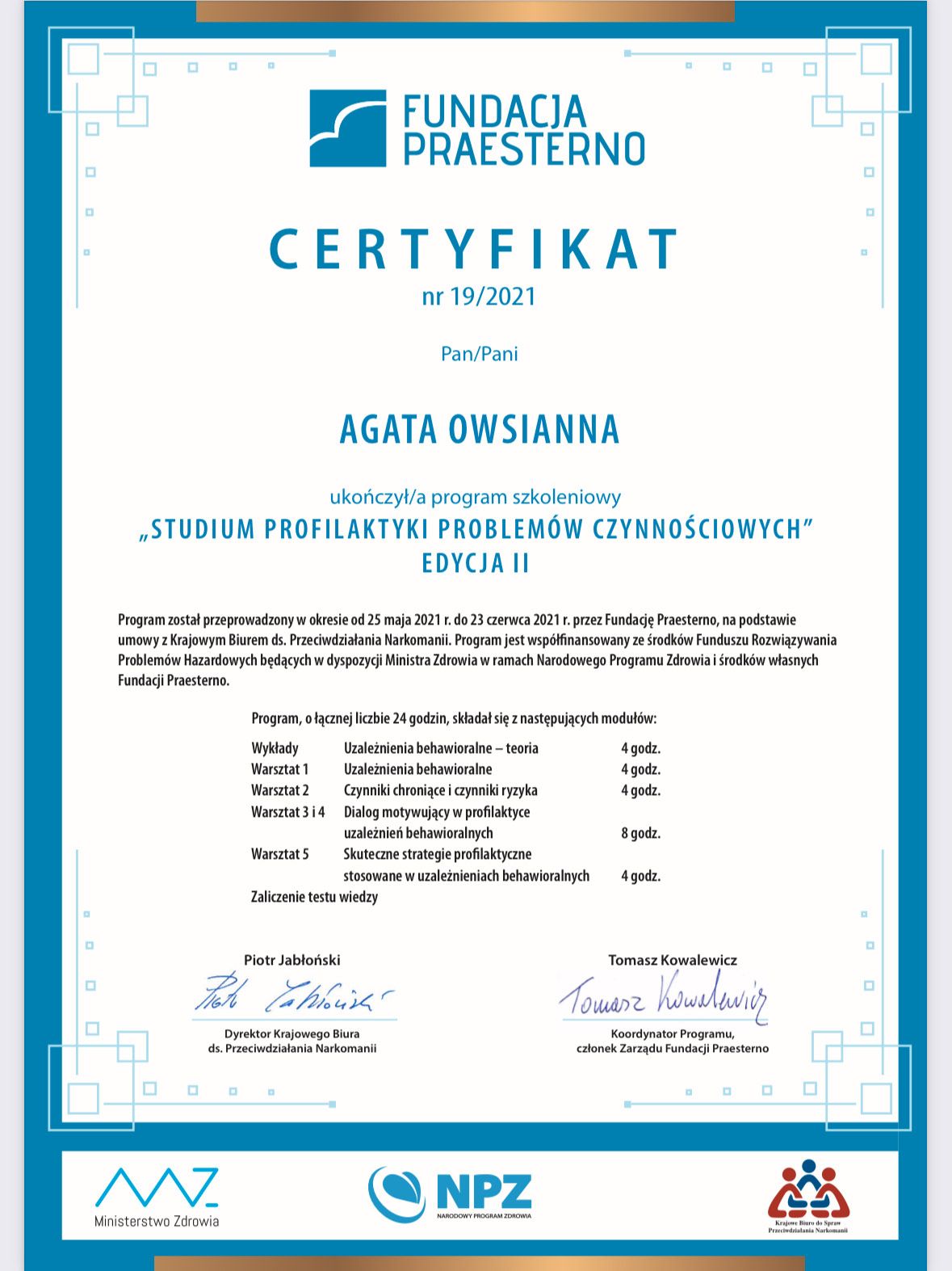 Jestem certyfikowanym specjalistą psychoterapii uzależnień oraz pedagogiem i socjoterapeutą.